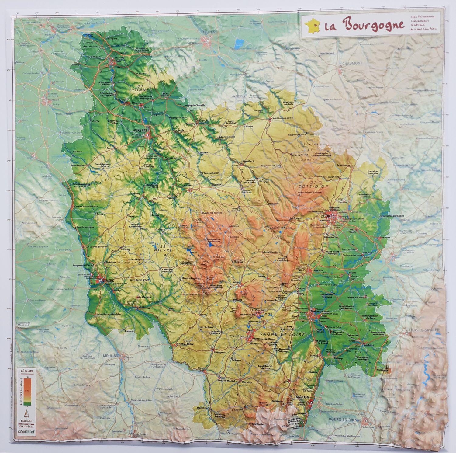 The Burgundy Relief Map is a physical map which is beautiful to look at. I find it quite successful and I googled what it looks like at Lac des Settons. It's pretty much in the middle of the map and it caught my eye right away. A little something for the wine lovers could have been accommodated. Fontainebleau (after all, Louis XIII was born there) is just visible to the north-west. Bulgneville in the north-east, part of the Jura with Nantua in the south-east and finally Montaigut in the south-west and you are already in the Auvergne. The card is also available with a bright lime frame.